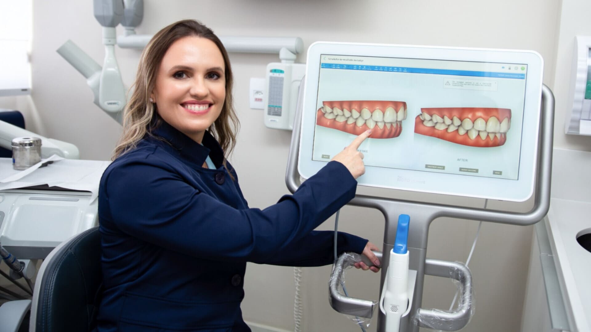 O scanner intra-oral representa uma inovação significativa, permitindo que a imagem dos seus dentes e gengivas sejam projetadas diretamente na tela do computador com alta precisão.
