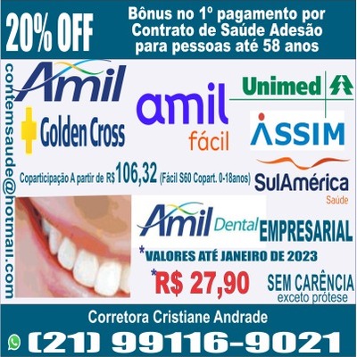 A corretora Cristiane Andrade possui vasta experiência no mercado e trabalha com as principais empresas de planos de saúde, como Amil, Amil Fácil, Golden Cross, SulAmérica Saúde, Amil Dental empresarial – Valores até janeiro de 2023, R$ 27,90 sem carência (exceto prótese)